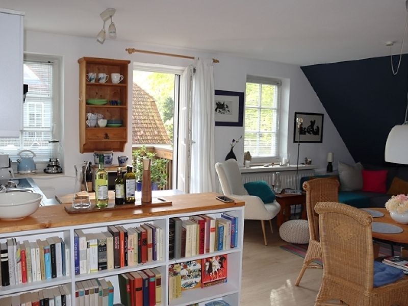 - Wohn-Essbereich mit kompletter Küchenzeile (Herd mit Backröhre, Geschirrspüler, Kühlschrank mit Eisbach, Mikrowelle, Wasserkocher, Kaffeemaschine etc.), Essplatz, Couchgarnitur, Sat/TV und Ausgang zum Balkon (mit Markise)