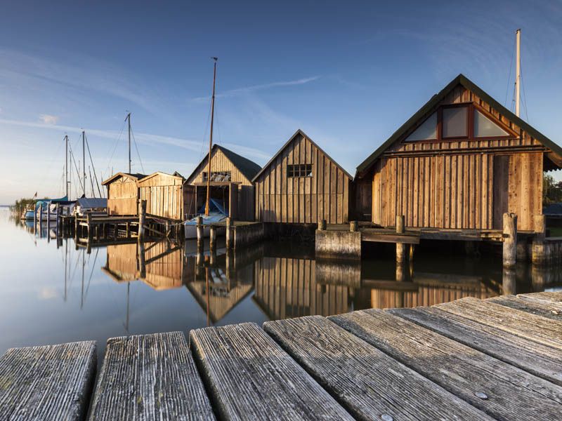 Wieck auf dem Darß - eingebettet in Wiesen und Wald zieht sich das verträumte Wieck etwa vier Kilometer am Bodden entlang. Am Hafen herrscht ruhiges Treiben beim Ein- und Auslaufen der Zeesenboote und kleinen Sportboote.